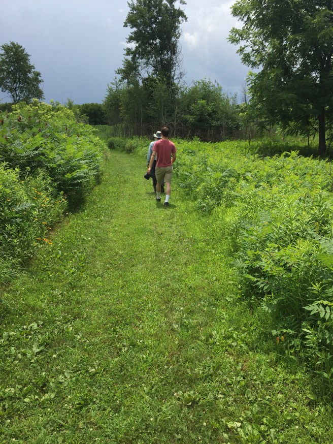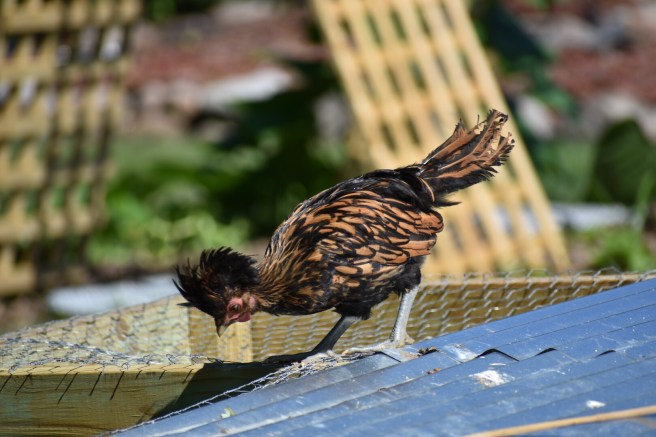 The chickens were clucking contentedly in their little chicken tractor when we arrived. One of them was a rogue male who had accidentally been part of their chick shipment. He was a beauty, but scrawny and not destined for the dinner table.