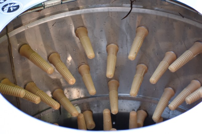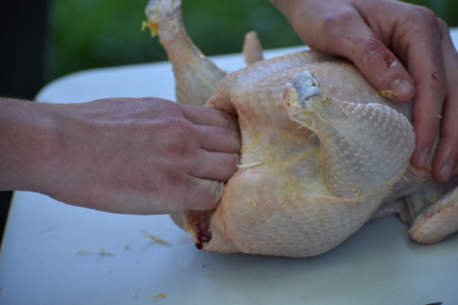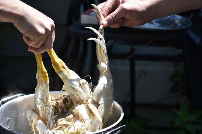 Once a wing feather can be easily plucked off without resistance (this usually takes less than a minute in the hot water), the bird can go into the de-feathering thingy, which is the slickest piece of machinery you can imagine. It’s filled with little rubber “fingers” that essentially pluck the feathers off while the chicken is bounced around and in 20-30 seconds, you have a naked bird, ready for gutting. Take a moment to appreciate the sheer genius of this labor-saving device. You can bet our friends appreciated it.