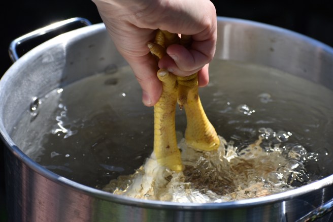 On to the scalding pot! Chickens come with these great little handles with which to hold them upside down. The scalding process is to loosen the feathers.