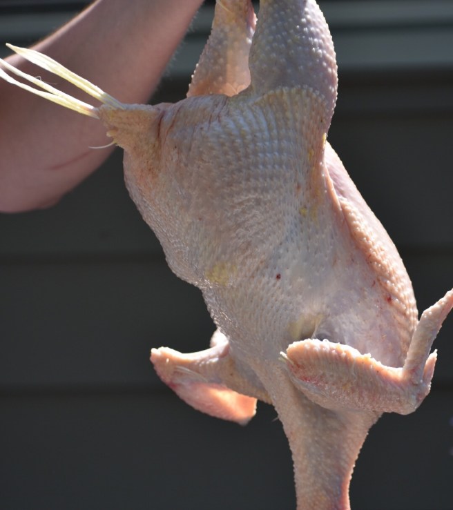 The head and tailbone are cut off and then you’ve gotta be willing to get your hands dirty and pull the guts and lungs out. The whole process took about 10 minutes from hopper to cooler. If you’re a meat eater (and I definitely am), it’s actually a good idea to know from whence it comes and how it got to your table.