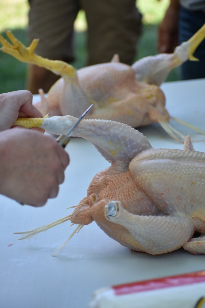 When the scalding water got up to temperature, the moment of truth had arrived. One of these plump little hens was chosen, placed upside down in the chicken hopper, its head firmly grasped and the throat deftly cut. The whole process was very quick and humane. It took a couple minutes to allow the blood to drain out into a bucket and for the chicken to settle (the post-death convulsions are a real thing).