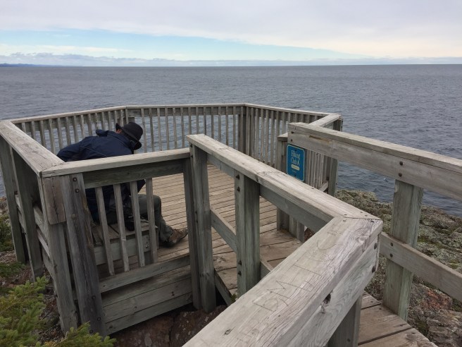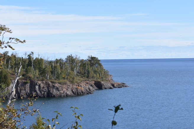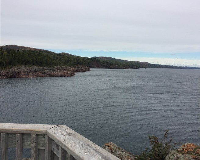 Although we’d just been to Gooseberry Falls State Park in the morning when it was sunny and nice, by the time we got to Tettegouche, the sun had gone behind the clouds and the wind had picked up. While it wasn’t exactly the “gales of November came early,” it was a bitter cold wind, especially when we were out in the open. In addition, I was definitely beginning to feel my lack of in-shape-ness (legs tired, feet sore), so it was encouraging to note that the hike was only 2 miles – 1 mile out to Shovel Point and then 1 mile back.