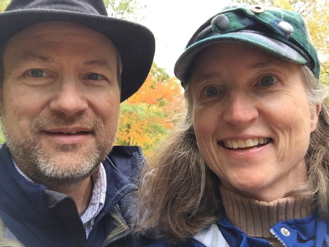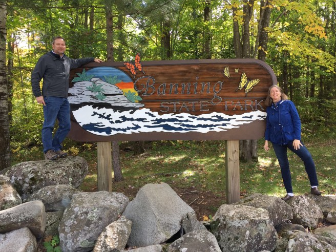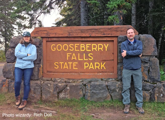 The headline shocker here is that Tettegouche State Park has NO SIGN. We thought we must have just missed it, so I asked one of the park employees, who looked somewhat puzzled at the question (“A sign? No, we don’t have anything like that.”). Well, there ya go. We had to improvise, posing instead by a random park events sign and having our photo editing guru (thanks Rich) insert a photo of part of a poster we saw in the park store into the sign, in addition to putting us magically in the same photograph. He is definitely overworked and underpaid.