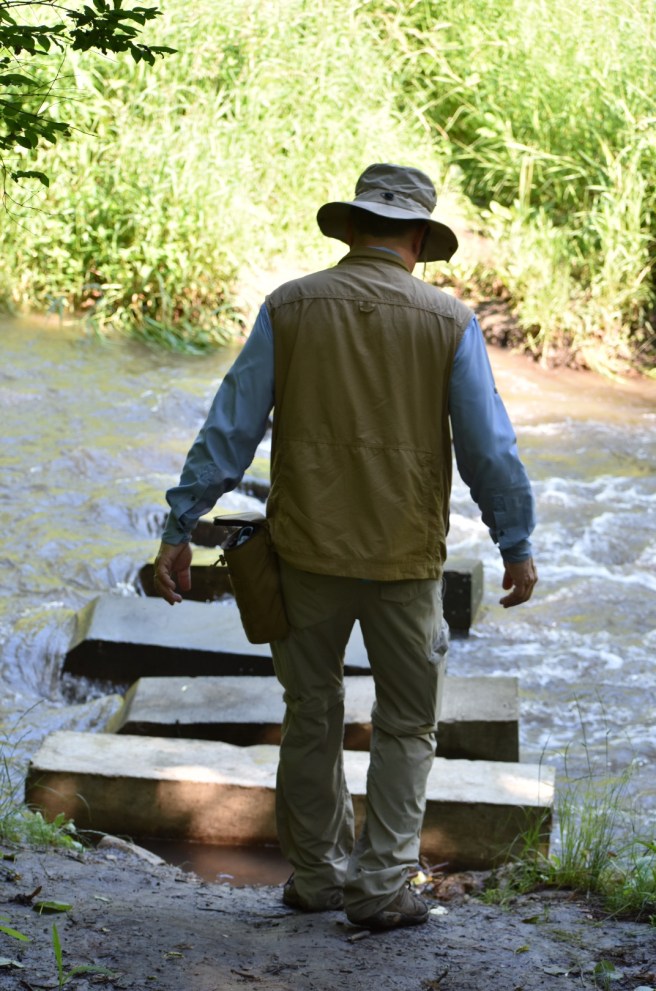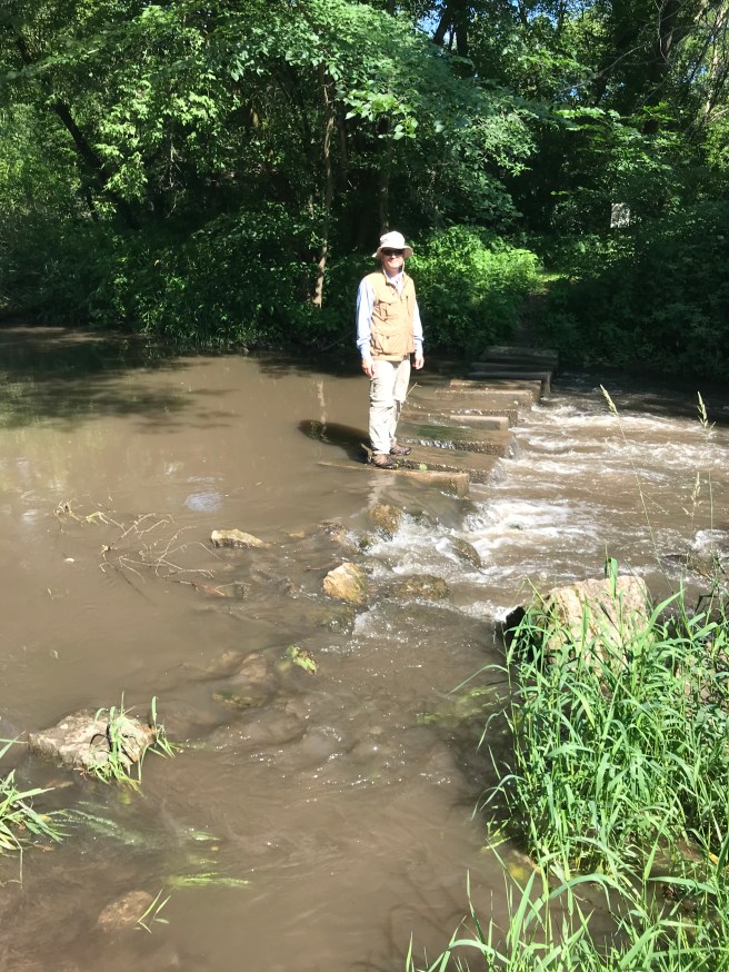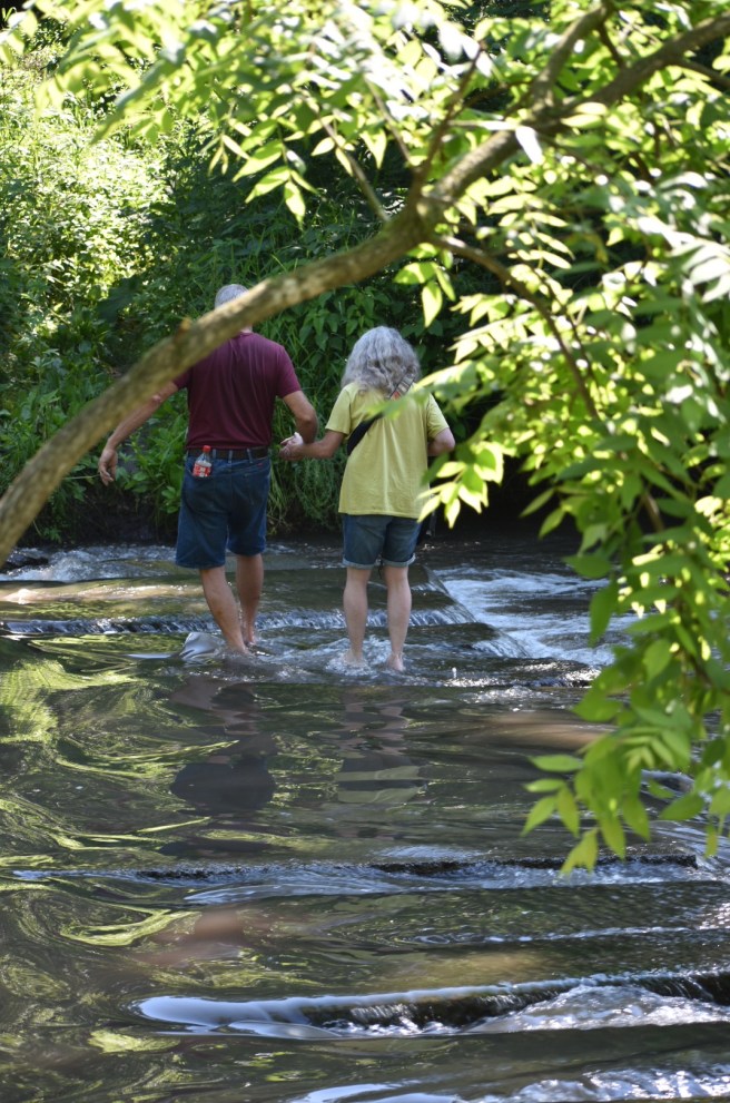 We started off again, still in good spirits. We passed a father with his two young sons carrying little fishing poles. It was so sweet, like a Norman Rockwell painting. And then we came to another “bridge.” You could actually see concrete blocks as a bridge for this one, but some of them were submerged and the water was rushing over them fairly swiftly. Again, we stopped to ponder our options. Kris thought maybe we could just take off our socks and shoes and cross over with bare feet. As we watched, another couple did that very thing and it looked like shaky, slippery business the whole way for them.