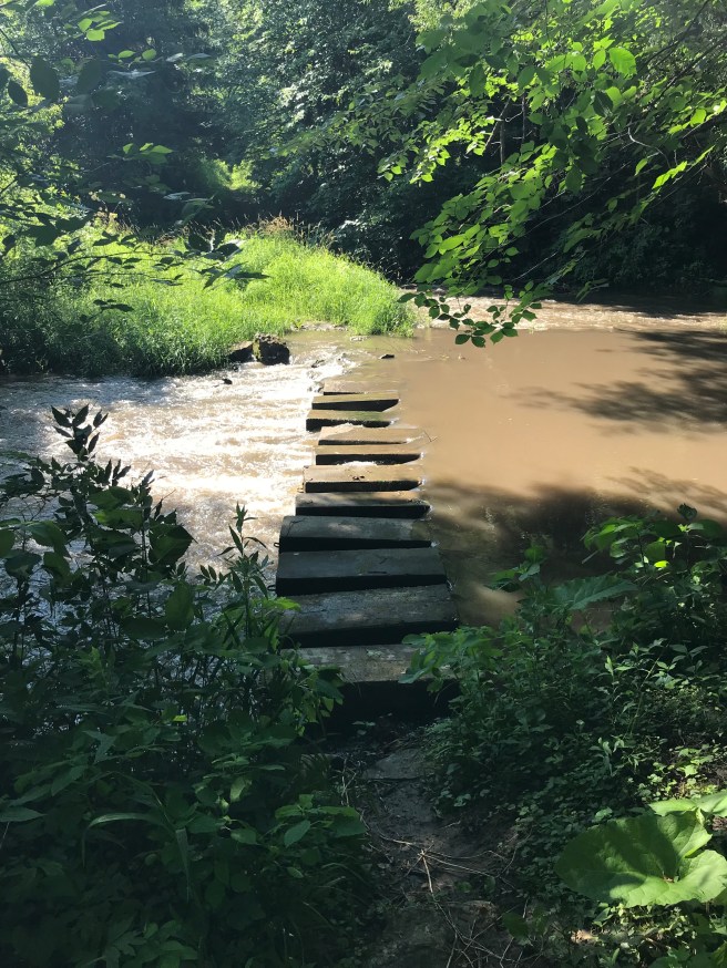 The trail ran alongside a small river (let’s call it a babbling brook, just for fun). The weather was perfect and it was one of those “God’s in His heaven and all’s right with the world” moments. Then we came to the first bridge. Or what should have been the first bridge.