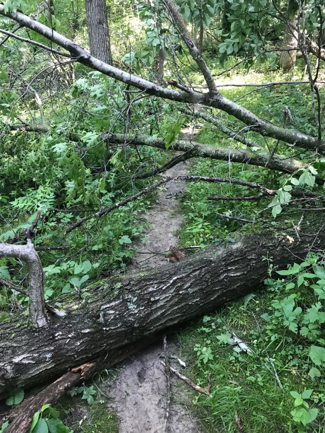 We encountered a tree blocking the trail on the way down, but by this time, we were becoming used to the appearance of roadblocks and merely walked through the brush on the side of the trail to get around it.
