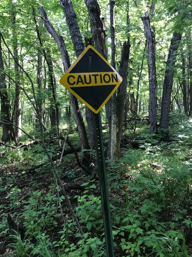 Now, where is that password sign? We walked uphill and down and the trail was slim and muddy. I was mincing along like the old person that I am, being especially cautious not to slip and fall in the mud. At last we came to a sign, which read “Caution.” “Look!” I said, “The password is ‘caution!'” I thought it was worth a try.