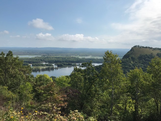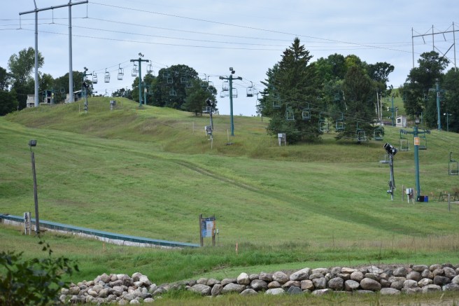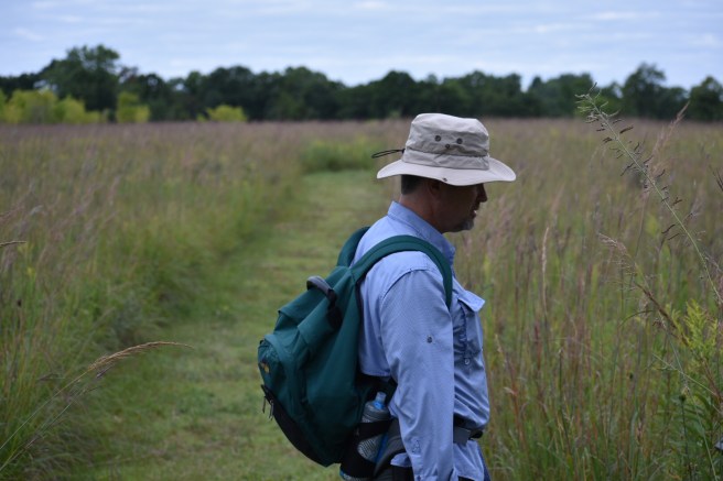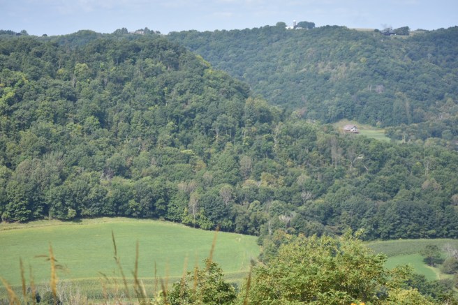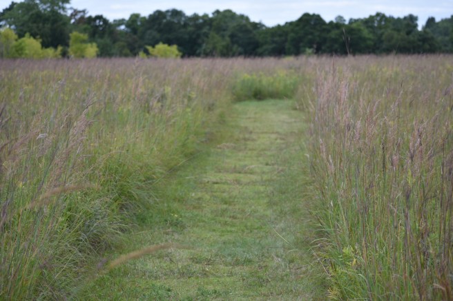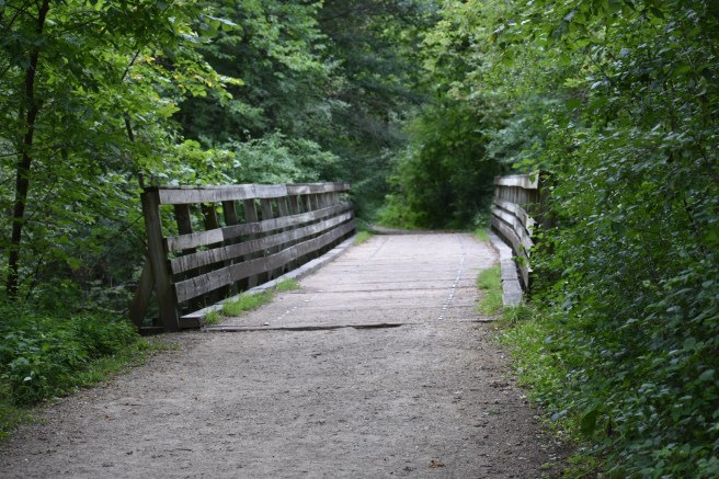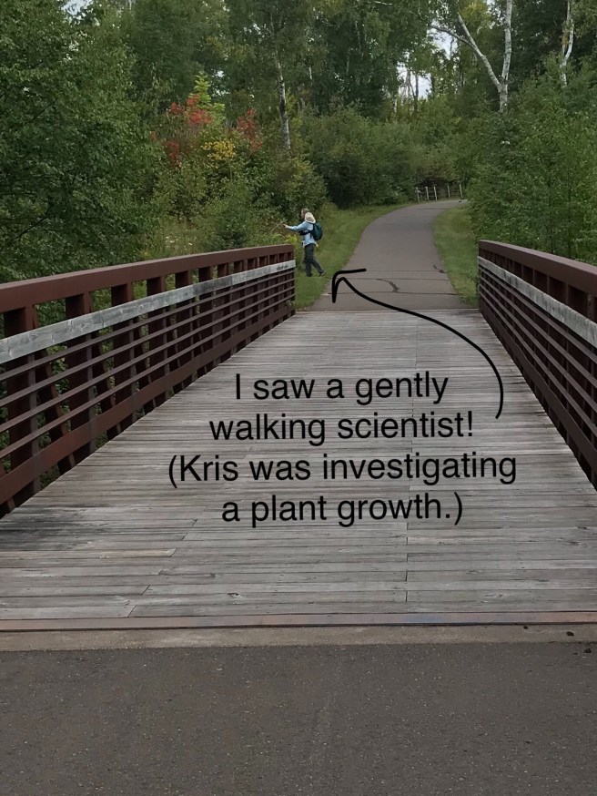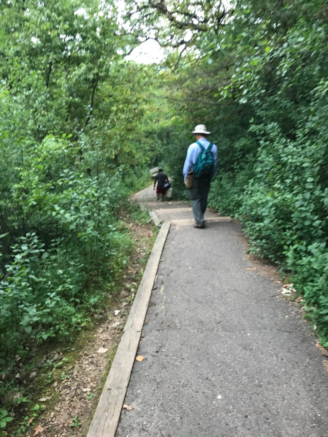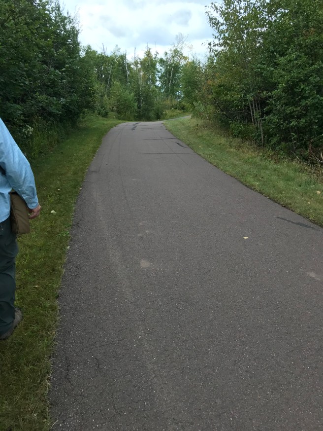 After an early uphill jaunt, we came out to the place where the trail was also a bike path, wide and paved. It’s actually easier on the feet to walk on grass, so we avoided the asphalt when possible.
