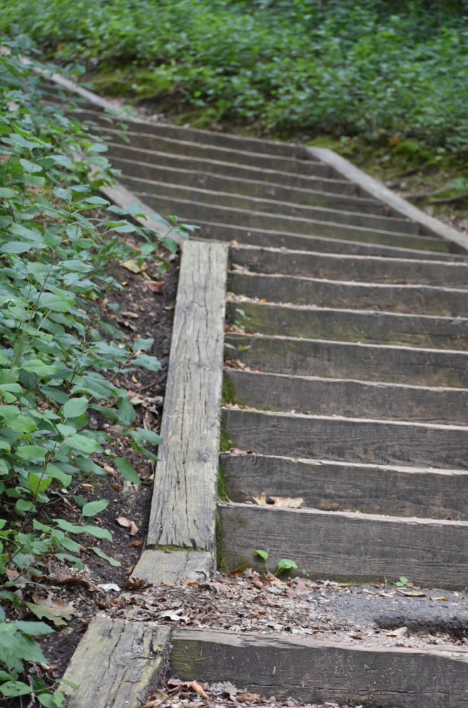 Back to the trail. We figured we were about a mile from the end by now and I remarked that I was getting my second wind. And then we came to the Steep Stairs of Doom. A young family was going up the steps ahead of us and their toddler was using his hands to help him get up the steps, it was so steep. I did likewise and although it felt a little silly, it helped ease the pressure on my knees (and brought great amusement to the toddler).