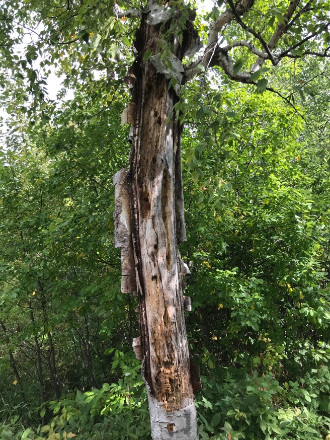 When we got up to go, our bodies protested and we had a contemplative discussion about aging. In the midst of this discussion, we came across a battle-scarred old birch tree. It was hard to believe that such a ravaged tree could still be alive, and yet green leaves adorned some of the branches.