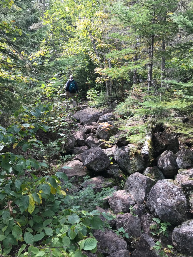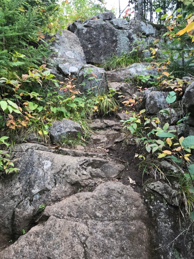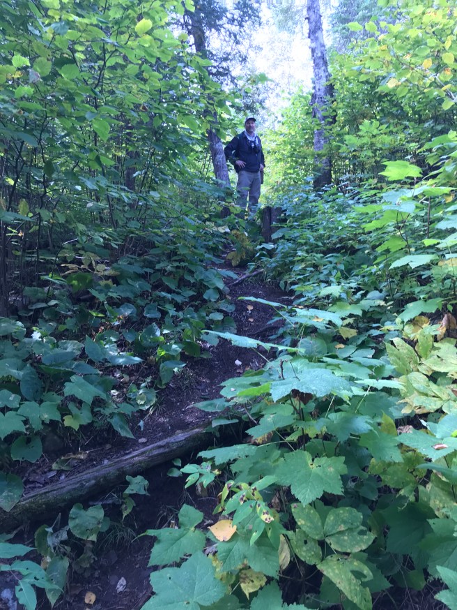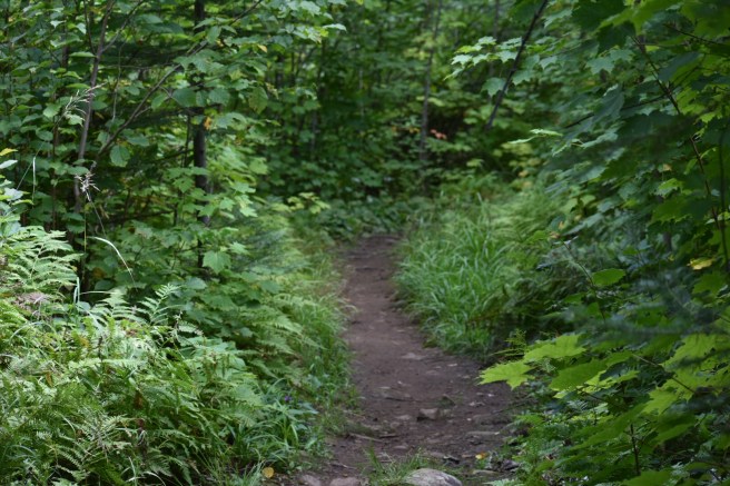 The sky was dark with threatening rain, which somehow made our secluded hike somber and contemplative. We didn’t talk a lot and we didn’t take many photos. We walked by a largish pond (or was it Moose Lake?) toward the beginning of the hike and hoped to see some wildlife on, in, or above it, but it, too, was deserted.
