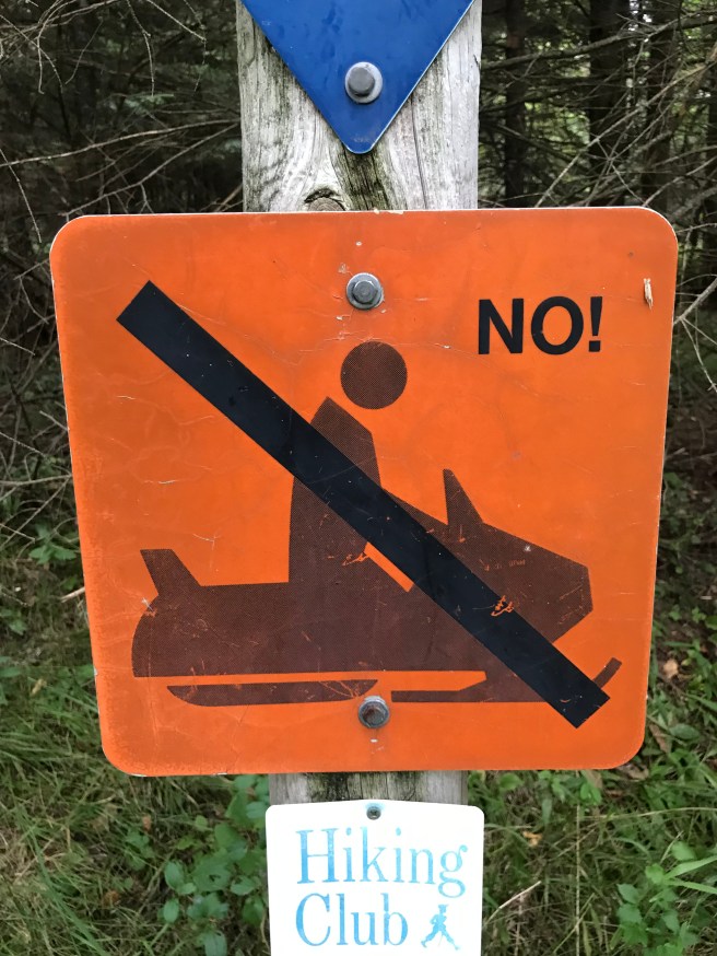 I would have expected something more along the lines of “Please don’t use your snowmobiles on the trail,” but this gets the job done with only one word and an exclamation point. It’s like a mom made the sign for her kids. I approve.