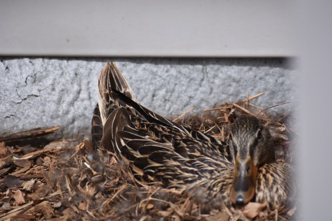When I went to work a few days ago, my friend told me she had something to show me. We went out back and quietly crept around the front so I could see the momma duck who had made a nest out by their front door. We whispered and stayed a respectful distance away, since momma had been spooked before and left the nest. During one of these absences, it was discovered that she is sitting on 10 eggs.