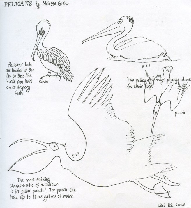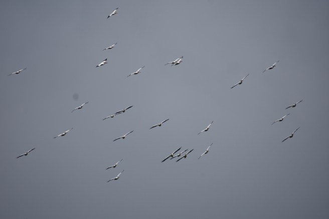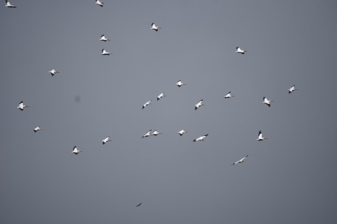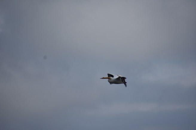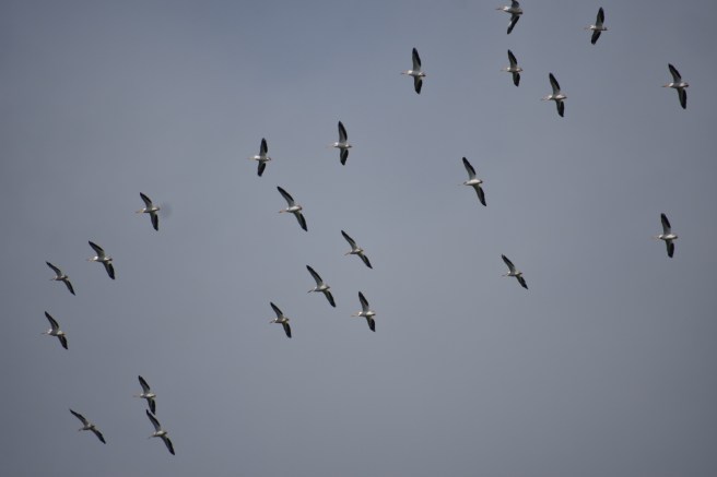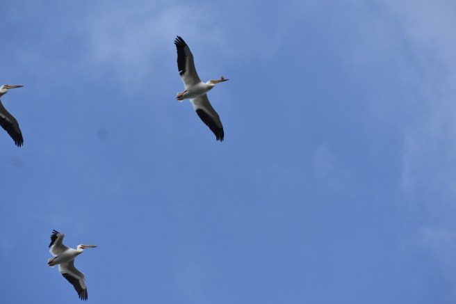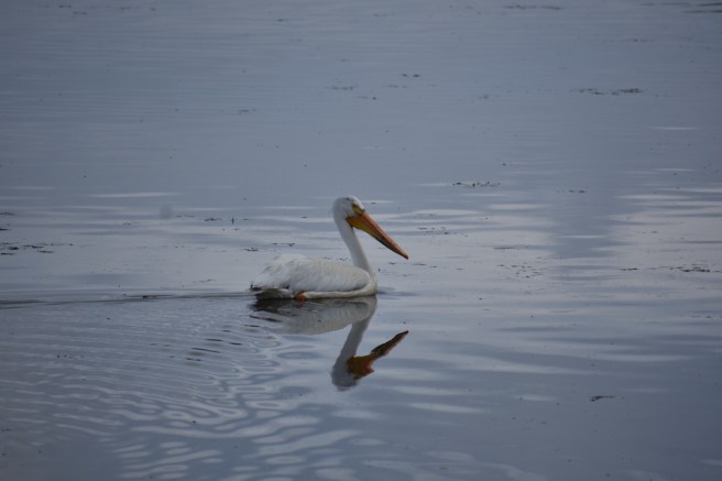 The first part of the hike took us most of the way around the island itself and then we got onto the causeway and walked across to the mainland. We began seeing groups of large white birds wheeling around in the sky and upon closer examination (i.e. we suddenly noticed that there were a few in the water right by us), we realized we were looking at a colony of pelicans. Farther away, we could see a large group, probably nesting. One of my drawing projects had been pelicans, so I enjoyed seeing them up close. I took lots of photos, but assuming you don’t want to see all of them, I’ll just select a few to post here.