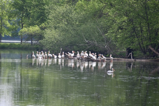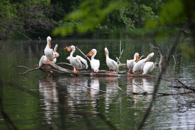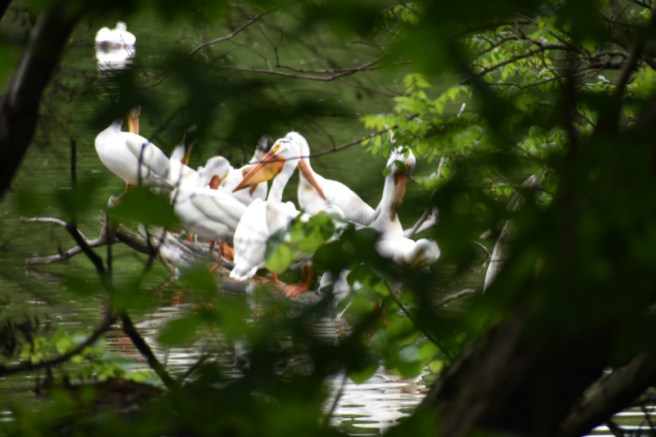 We were getting close to the pelican party and started trying to walk as silently as elves so we wouldn’t startle them into flying away. The elves make it look so easy. In spite of the fact that we kept clumsily walking on sticks that broke loudly, the pelicans were completely blasé about it. I snuck in a couple photos between tree branches.