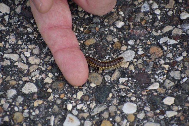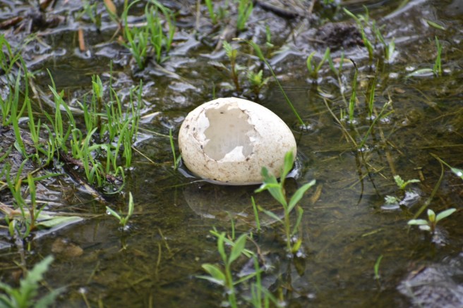 On the positive side of the ledger, Kris spotted a painted turtle that I’d walked right by. And a millipede. At one point, he saw an iridescent green beetle, but I was trying to get a photo of an odd-fly on his knapsack, so I missed it. Oh well… We also passed by a couple empty eggs and wondered if they’d been hatched or eaten.
