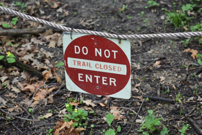 Kris didn’t see that sign, but I pointed it out, thinking this would necessitate a discussion. He didn’t even hesitate – off we went into forbidden territory. By this time we’d suffered punishing humidity, battled bug hordes and been on hazardous muddy trails. We were NOT going to be denied the pleasure of taking a trail that would bring us close to the pelican nesting area that we’d seen earlier (not to mention the possibility of seeing cormorants. Which, spoiler alert, we didn’t.).