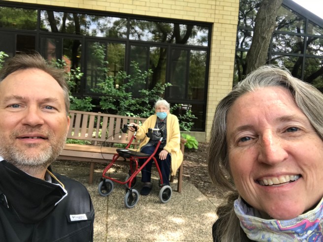 I finally got a chance to have a socially-distanced meeting with my Mom recently. I longed to be able to hug her and kiss her on the cheek, but had to be content with sitting 10 feet away and trying to understand each other while talking with masks on (we took ours off for the photo).