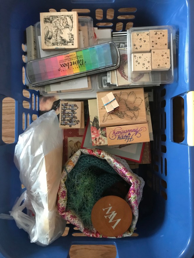 My daughter helped me go through stuff in the craft room while she was here, which gave me a good start on that last item. We’d like to downsize at some point and definitely don’t want to bring all the accumulation of the last 15 years with us. Here’s the first bin of give-away for 2021: