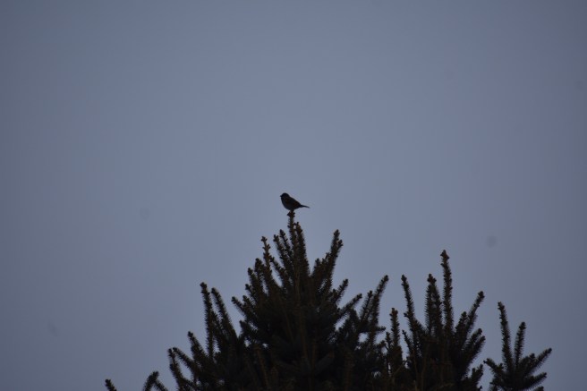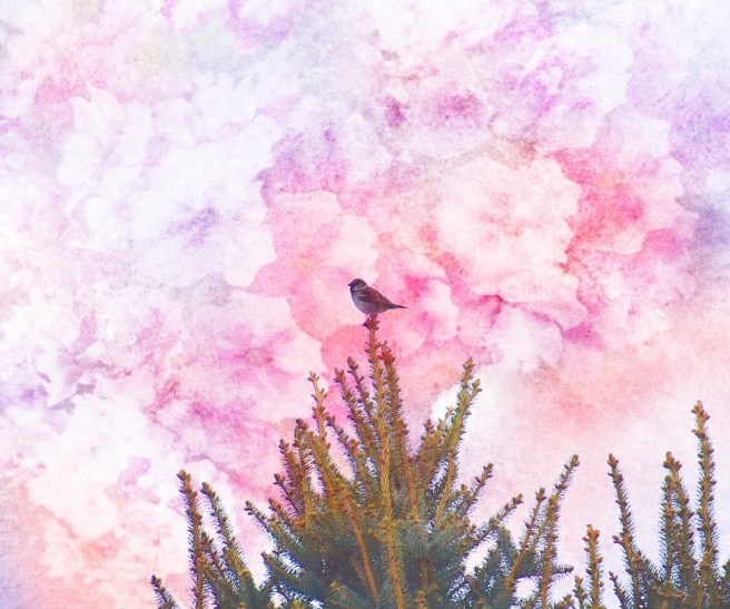 It looks good as a silhouette (although I now see that another pesky dust particle has crept into my camera). I wanted to know what kind of bird it was, so I brought it over to a photo editing app called PS Express to bring out some of the detail. Then I noticed that you can augment or enhance the background of the photo and, ooh! Look! Watercolor background! Is it still art if all you did was make some editing choices? You may weigh in on that deep philosophical question if you’d like. It feels like cheating to me.