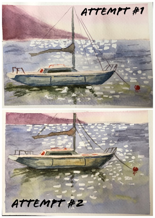 I enjoyed working on this one so much that I did both of them in one day. The masking for the water didn’t turn out as well as I’d hoped – apparently more finesse is required for this than I was capable of. Amazingly, though, I think all of these practice sessions are helping me to understand more about color mixing and how much paint and water to use.