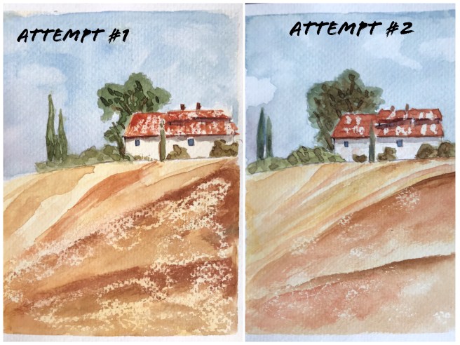 I couldn’t figure out how to lift off the color of the sky to make clouds. You’re supposed to use a dry brush. Ha! The trees and shrubs simply defeated me. And the field – too much wax on the first one, not enough on the second one, plus I struggled with all the different colors. The only part I was really pleased with was the lower roof shadow on attempt #1 and even that’s kind of scraggly looking.