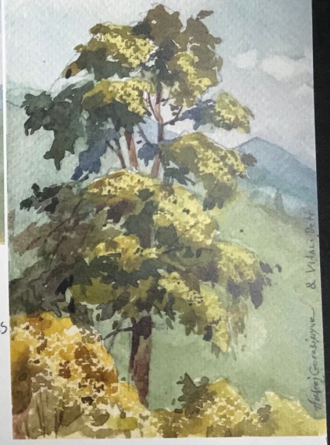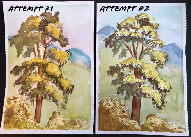 Which one do you like better? I just realized how much fatter the tree trunk is in the second one. Also, I seemed to have added another mountain to the second one. The instructions on the tree for this painting were too vague for me. By the time I was working on the “half tones” and the “shadows” and giving “shape to the leaves,” I neither knew what I was doing nor cared. It’s all a big mish-mash to me.