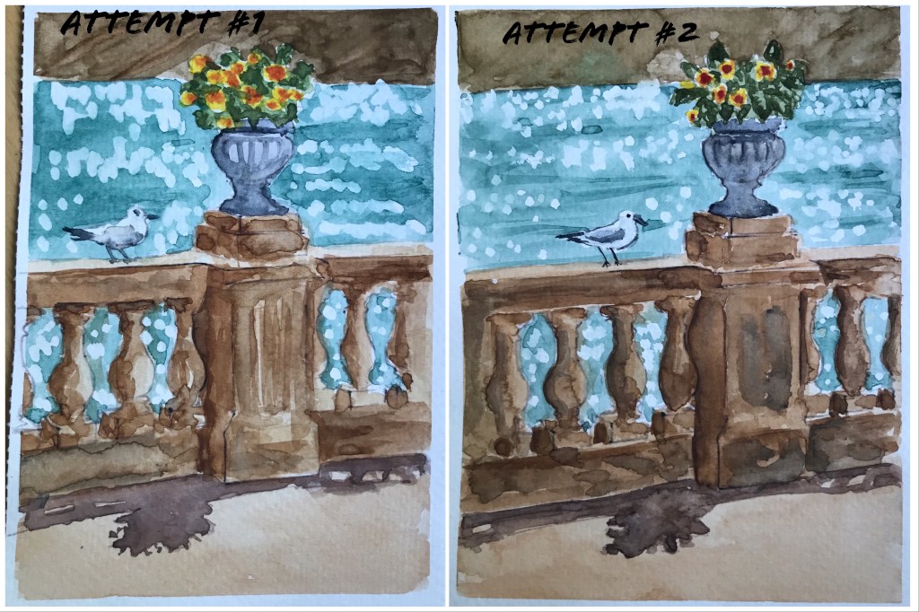 I changed the color of the flowerpot, because I just bought a tube of “Payne’s Gray” and I’ve really been wanting to use it. I tried to put a little more definition on the flowers and leaves in the second attempt, but I suppose the “blobby” look of the first one isn’t too bad. Which gull do you like better? I was really excited about the second one until I messed up the beak. Also, note that there was neither gull nor flowers in the original photo – they were added by Artistic License and I heartily approve.