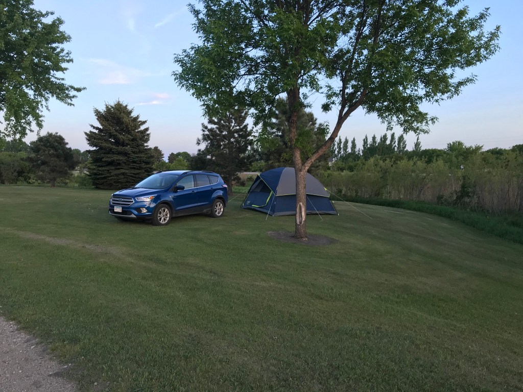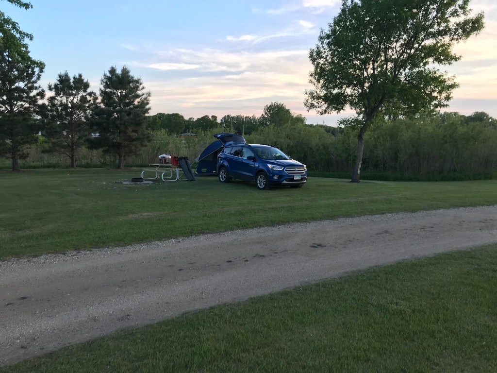 Our first campsite was at Wagner Park in Barnesville, MN. This place gets two thumbs up from us. The state parks were all filled up for the weekend, so my husband found this place and we hoped we wouldn’t have trouble finding a good site there. It turns out that if you choose the non-electrical hook-ups, there’s not much competition for those sites. We were camped near a little creek and close to the bathroom (with flush toilets!). Add a campfire into the deal, and you’ve got Camping Paradise. It got down to 44 degrees that night, which admittedly subtracted a wee bit from the paradise vibe. But we are Hearty Minnesotans – and we have warm sleeping bags.