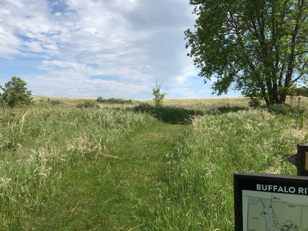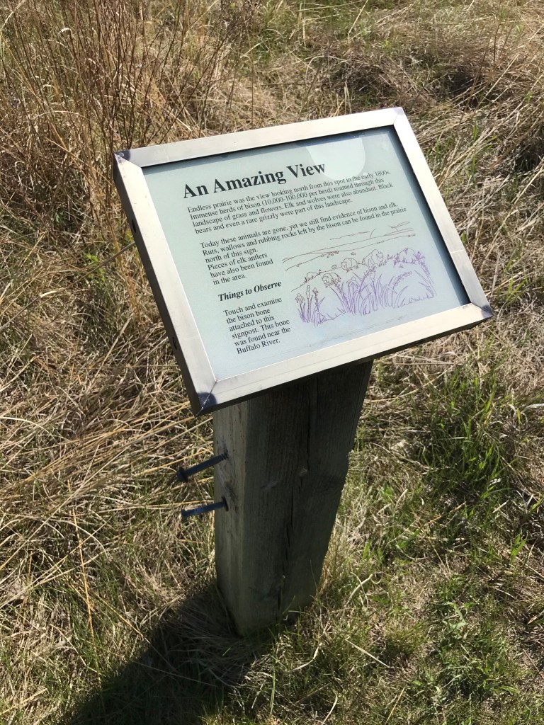 One of the first signs we saw mentioned the amazing view of an area where buffalo used to roam in the thousands. We were instructed to touch and examine the bison bone attached to the signpost, but alas, the bone was gone. “The Case of the Missing Bison Bone” sounds like a good mystery title, doesn’t it?