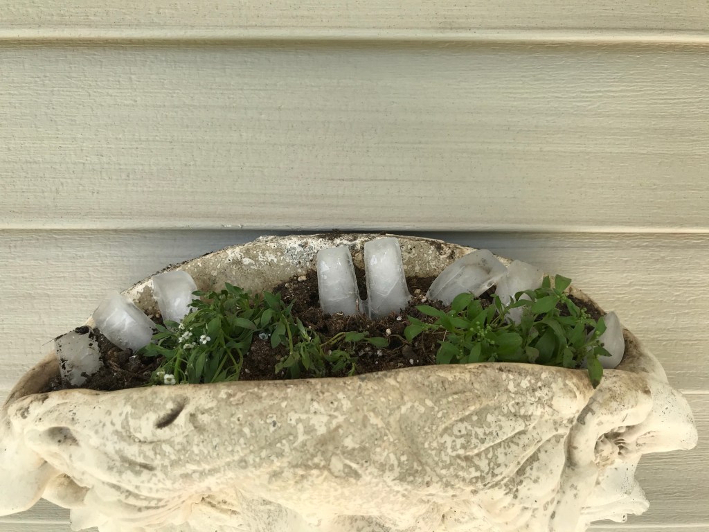 I love having a planter that looks like a person, but this one that used to belong to my mother has always been very hard to keep watered because the opening is so shallow. Whenever I tried to water it, the water would just run down the side. I mentioned it to my mom once and she said she used to use ice cubes which would slowly melt in. It’s brilliant!