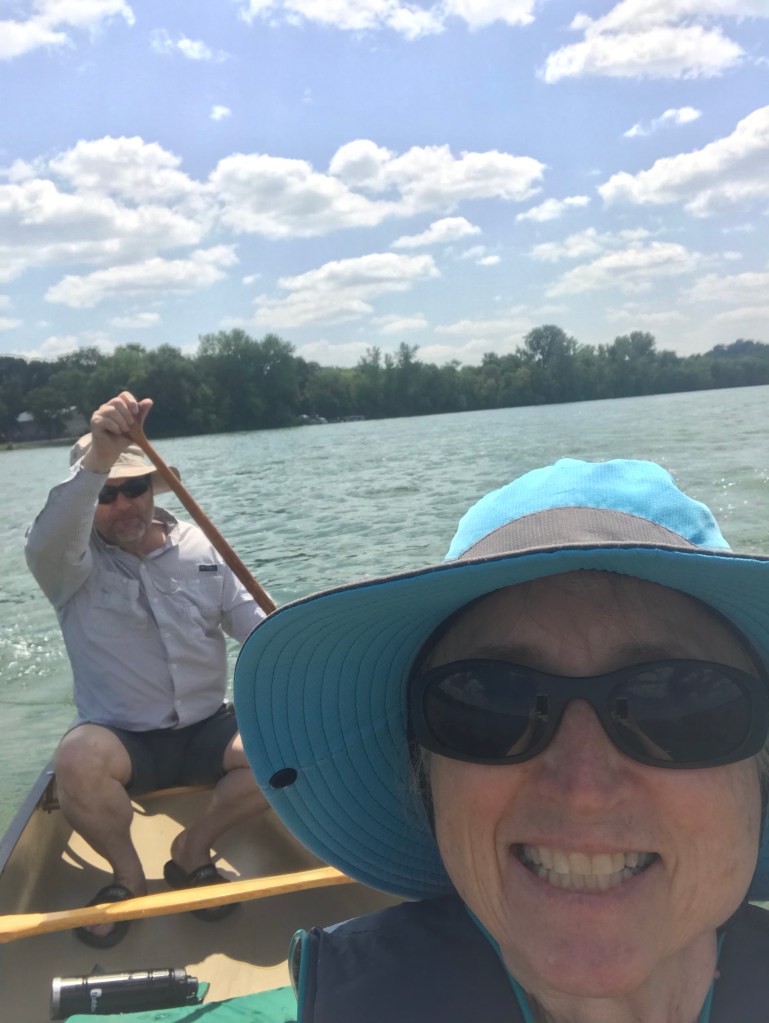 Arms remembering old skills, paddles cutting into the waves, blue skies, sweet companionship, pelicans overhead, ducks bobbing along, motorboats making choppy waves, our sleek craft riding high on the water, pulling up at the dock, hoisting the Old Town onto Big Bertha.