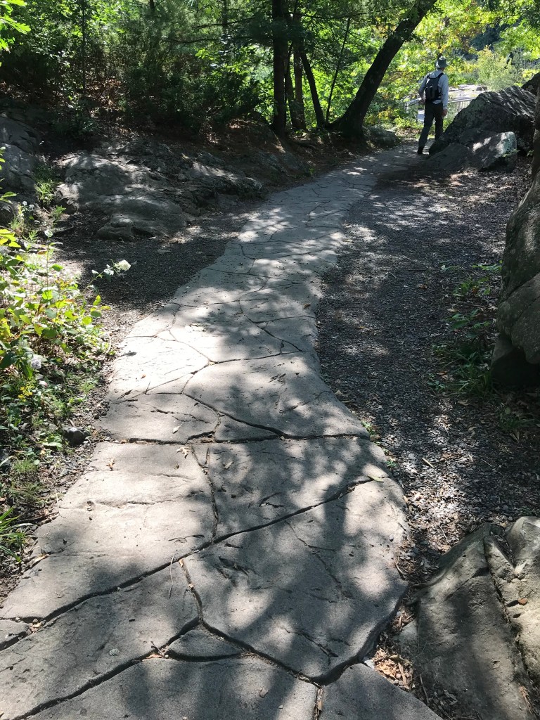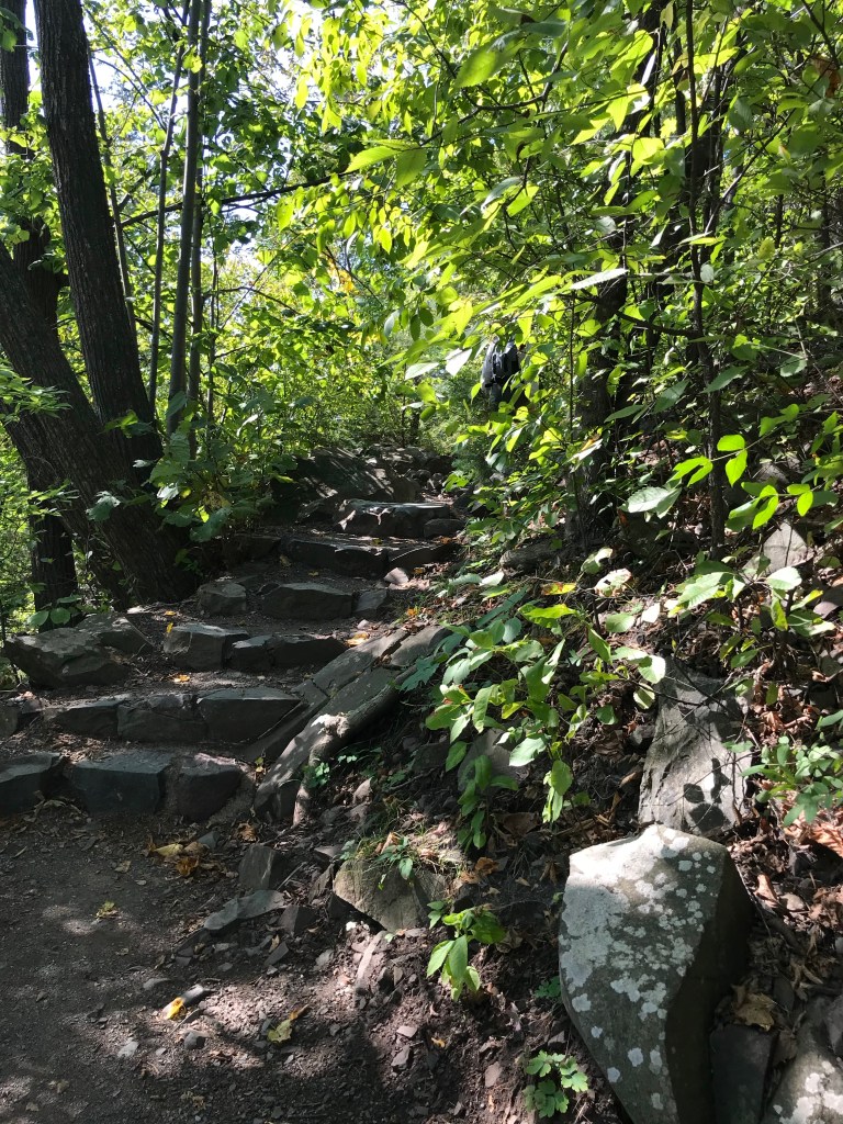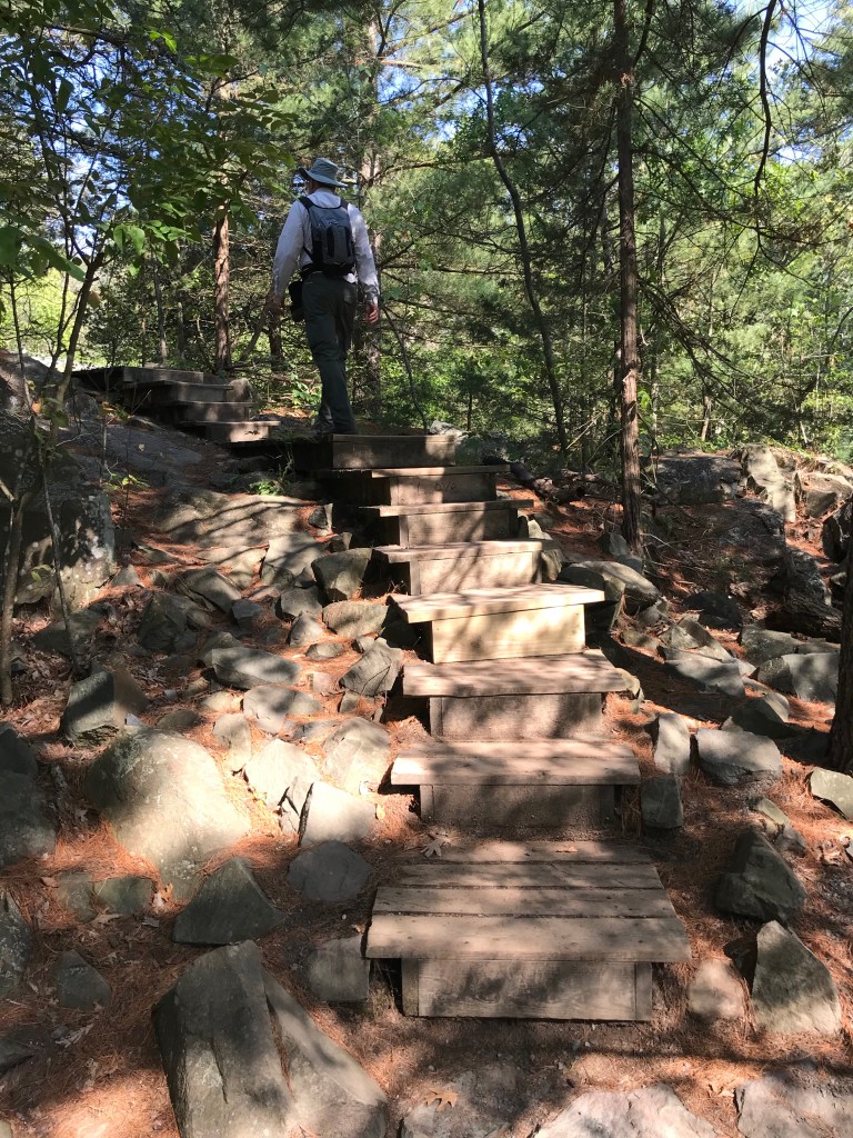 Although most of the time you couldn’t actually see the highway, you could still hear the trucks and cars whizzing by, which gave you less of a sense of being away from civilization than you can get at most parks. Still, the trail was of the kind that is my husband’s favorite – a little on the rugged side with some rocks and tree roots to step over. The park people had also put nice wooden stairways in here and there for people like me. Thank you.