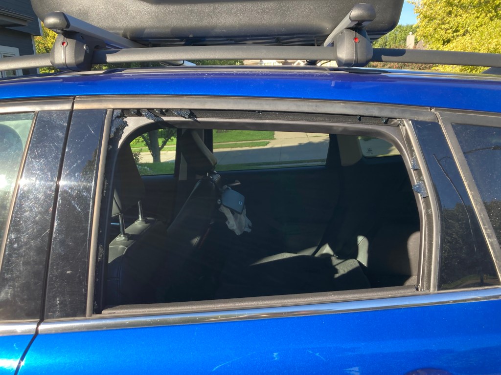 At 5:45 a.m., Mr. Friend came downstairs and woke Kris up. I sleepily overheard bits of a hushed conversation that made me think that Mr. Friend had accidentally backed into our car on his way out of the garage. Then I heard the ominous words, “So, you’ll want to go out and see if anything was stolen.” I shot out of bed on pure adrenaline at that point and we both rushed outside. Sure enough, some hooligans (is it okay if I assume they were young?) had broken out one of our car windows and had helped themselves to some of our belongings. This was a rude awakening on many levels.