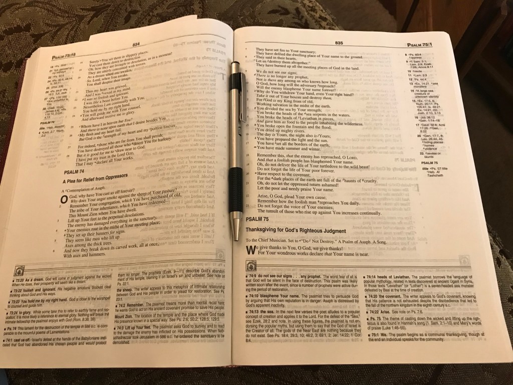 These kinds of losses end up putting things into perspective. It’s all just stuff, all replaceable. The loss that I felt the most keenly, however, was that they also took my Bible. It was in a carrier with handles, so Kris thinks they might have thought it was a purse. He had given it to me in 1996 and I had filled it with marginal notes, observations, lists, sermon notes, underlined verses, drawings, dated answers to prayers and even had a list of our children and their birthdates next to Psalm 127 that I had written in as our family grew. I doubt there was a single page in that Bible that didn’t have some of my markings on it. Every time I read through the whole Bible, I had written the dates in the back. I kept a collection of sweet and encouraging notes from friends over the years in one of the carrier pouches. A lot of my spiritual history was in that Bible.