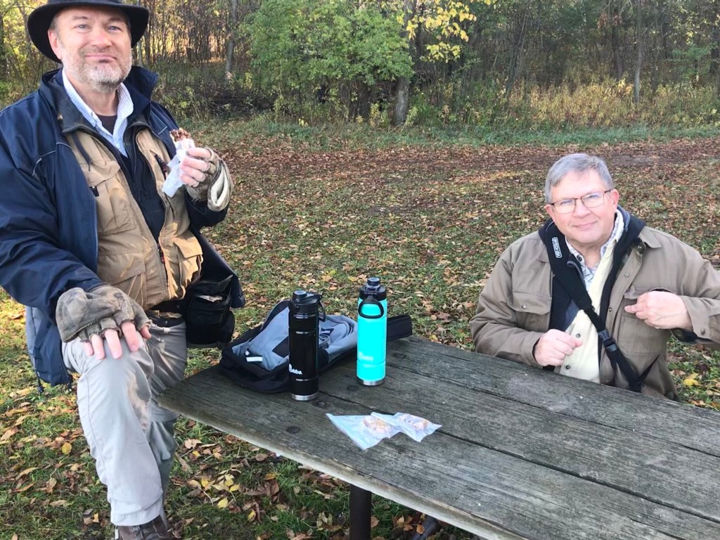 Our hike at Lake Maria State Park may well have been the last one for the year 2021. We chose the last Saturday in October to wend our way up there for the 2-mile hike. We picked up a third party for this hike: Kris’s brother Karl. This meant, of course, that Karl would now be privy to all of the secrets of the Hiking Club – the hand shake, the password, the official HC snack food, hiking tricks of the trade, everything – and all without even joining the club. He didn’t say it explicitly, but we’re thinking this had to have been a lifetime achievement for him, probably way up there on the bucket list.