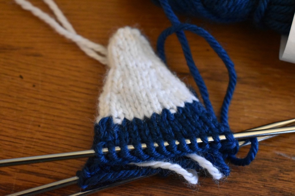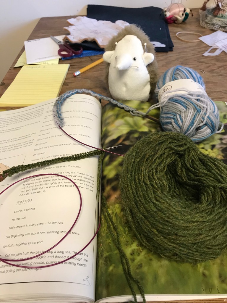 Those of you looking at this on the teeny tiny screens on your phones might have to enlarge the bit with Colonel Purslane since I put the knitted projects in the foreground. The colonel will look better when he’s done, but what do you think of the fur? Right now his ears look like weird little arms sticking out, so I’m hoping they’ll shape up as ears when I sew them on.