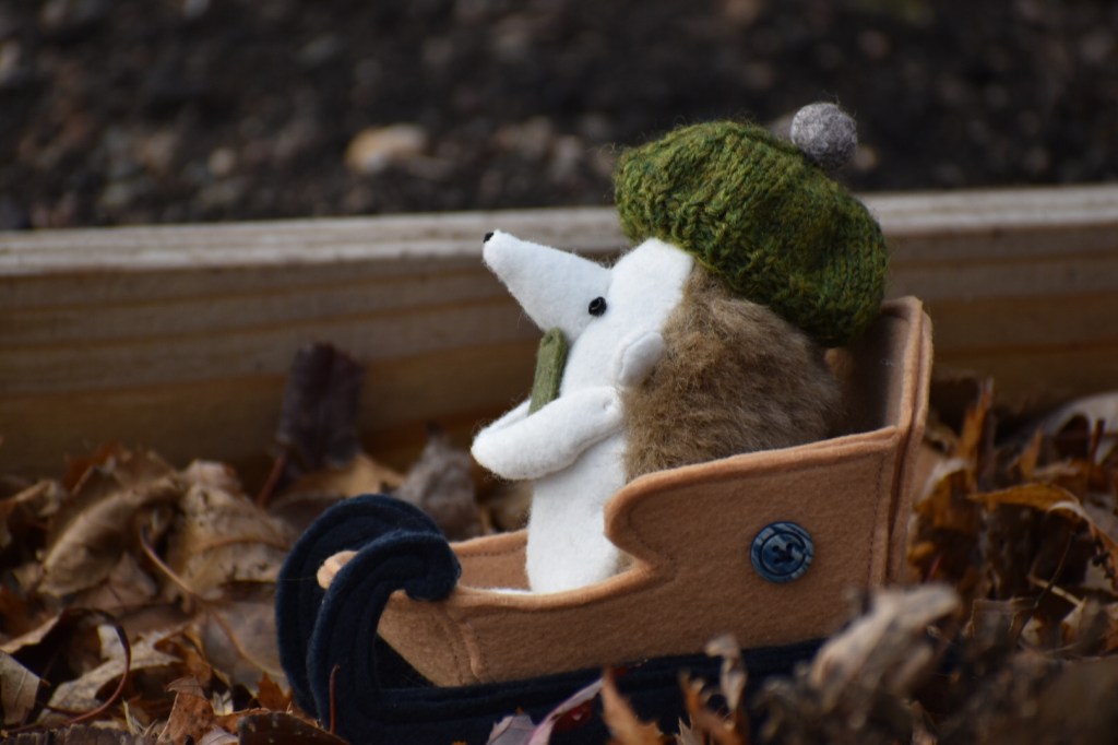 Fig Newton turned around and beheld the astonishing sight of a rather unimpressive looking hedgehog sitting in a sleigh, of all things. He wore a green tam on his head which gave him a sporty look. At first the frog wasn’t sure by what mechanism the sleigh could move on these trails, but upon closer inspection, he saw four mice harnessed to it. Miss Agra clapped her hands in delight at the whole scene, feeling suddenly much restored and encouraged.
