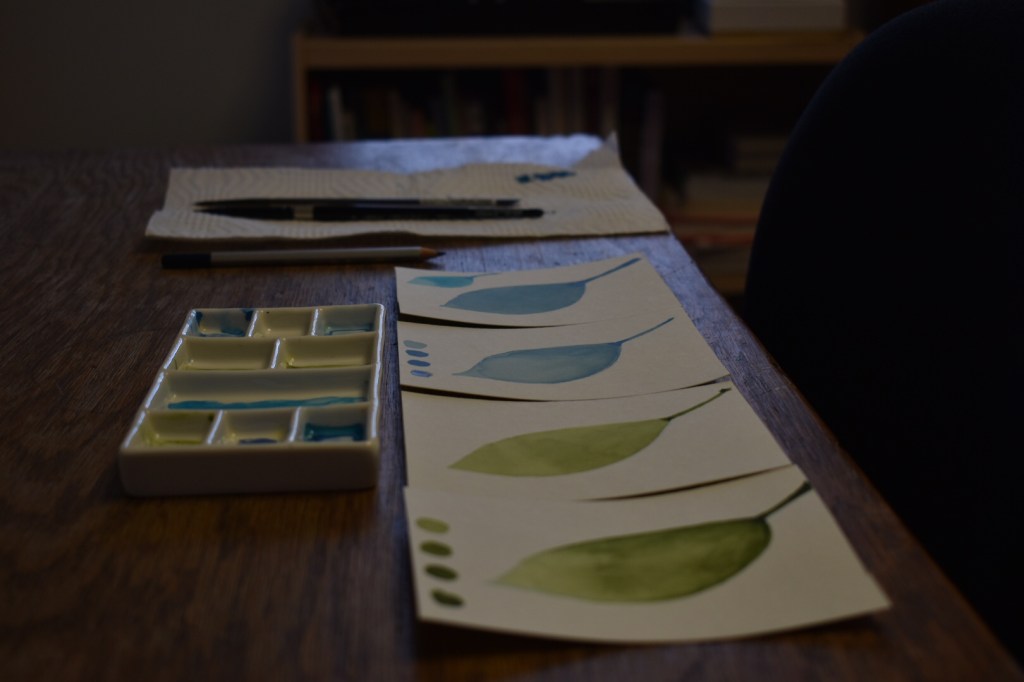 The leaf. We’re supposed to be learning how to show a gradation of color by mixing more and more water in it. Seemed simple, but wasn’t. I like the paint puddles almost as much as the leaves.