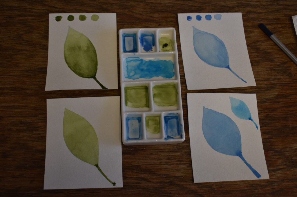 So I’m in the classroom again. I signed up for two online art classes through Udemy: Beginning Watercolor Essentials and The Drawing Masterclass. Both classes are starting very basic, but I’m excited about going on to more sophisticated projects. Here’s where we started out in the watercolor class: