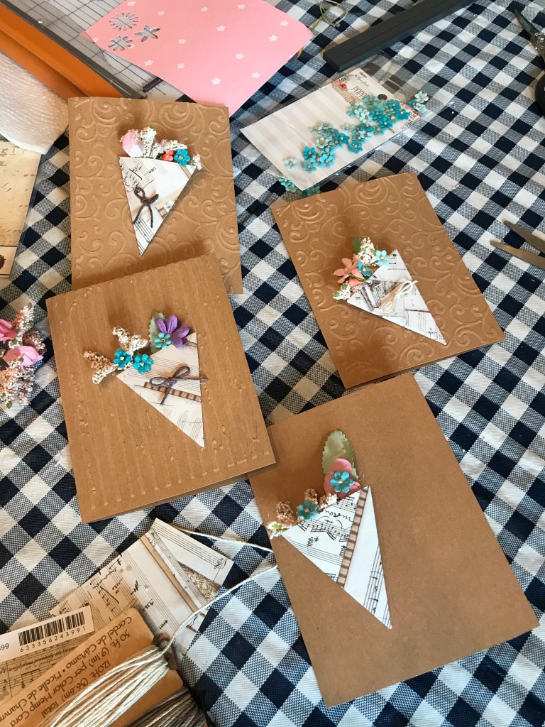 If you like doing crafty things, find yourself a crafting friend like mine. We’ll call her “Barb.” (Mostly because that’s her name, but it looks more mysterious to have it in quotes.) I found a photo of some cards that I liked and sent it to Barb with the comment that I thought we could figure out how to make them. The next thing I knew, we had ourselves a card-making date with her supplying nearly all the materials from her own crafting shelves (and she even made a trip to JoAnn’s to get additional supplies – above and beyond the call of duty!).