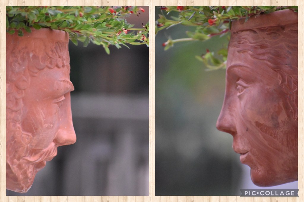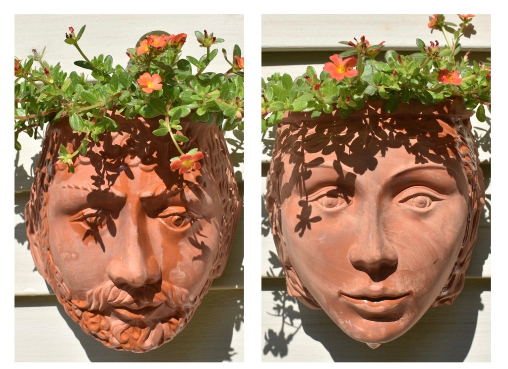If you’ve followed my blog for at least a year, you’ve seen me post about the Michael and Betty planters that I “inherited” when my mom moved into a small apartment. Betty was my mother’s sister and Michael was Betty’s husband. When Mom got those planters she named them right away, so they’ve always been Michael and Betty to me. I enjoy giving them different “hair” every year.