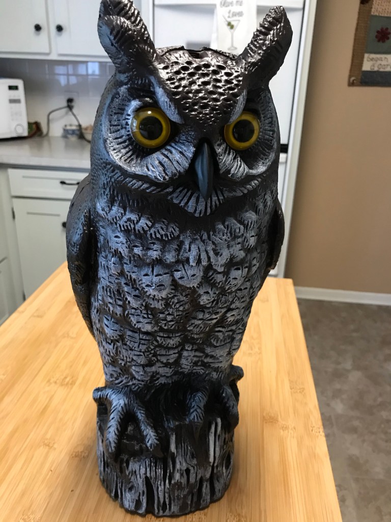 This fierce looking owl has one purpose and one purpose only. It is an owl meant to spread fear and dread into the little rodent hearts of the squirrels that take one bite of our apples and throw them on the ground. And if it provokes some horror in the birds that eat our raspberries, all the better. Be honest: if you were a squirrel, would the sight of this clearly fake owl throw you into a dizzy tizzy? According to the hostess of our B&B lodgings in Idaho, these really work. She had 7 of them spread through her yard. We decided to start with one.