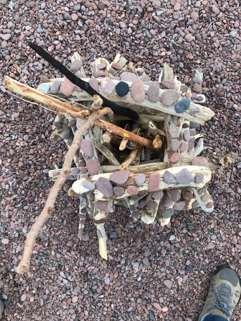 We went back to that beach the next morning and to my surprise it was still there. I imagine by now it has been reduced back to its constituent driftwood and pebbles. The passage of time tends to do that with everything that we make sooner or later. It’s humbling.