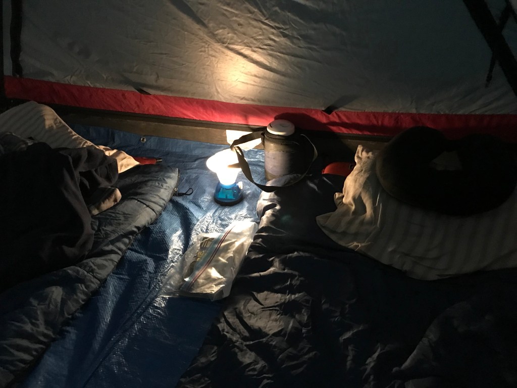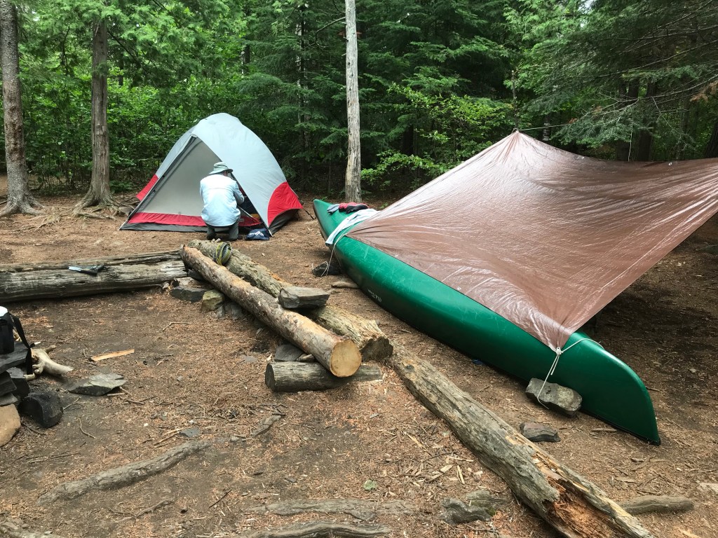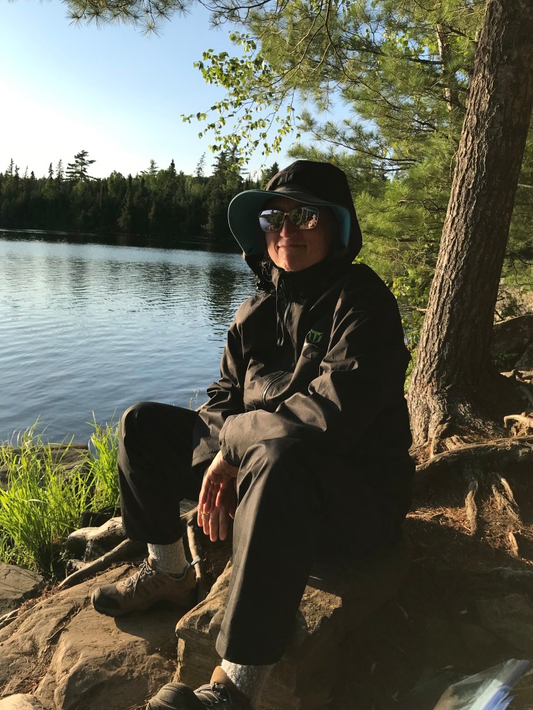 Then it rained. I put on the new rain suit that Kris insisted on buying for me for the canoe trip, the suit I told him I probably didn’t need. As soon as I donned it, I realized that this wonderful, marvelous suit was perfect for keeping the mosquitos from biting me. It was made of fabric that their devilish stingers couldn’t pierce. Hallelujah! The rain stopped, but I kept the suit on. In fact, I told my husband I’d probably sleep in it. He thought I was joking. I wasn’t, but as it turned out, I didn’t really need it in the tent. But for the rest of our time in the campground, I wore it constantly, even with the hood up to keep them off my neck.