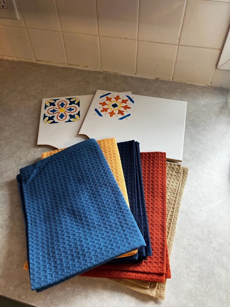 Here’s the latest project – adding some color to our kitchen. I did a couple sample stencils on some extra tiles (we didn’t have any extra 4”x4” tiles around) and am starting to realize how long this is going to take. I have four different stencils and am trying to decide whether or not to use all the different colors for each one (like above) or to do one color per stencil and vary them by color throughout the kitchen. Or should I just pick one color and use only that one? I’m not doing every tile – just select ones. I can’t imagine building a house and having to make decisions about every single thing in every single room. Anyway, opinions are welcome!