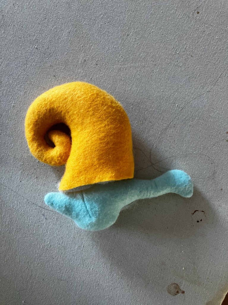 All of the felt creatures I’ve made have been different and unique, but one thing has been the same for each: “turn right side out.” Those four words are printed very casually in the instructions several times per project. The next part of the sentence continues on as if you haven’t just spent 10-20 minutes trying to turn that small felt contraption inside out without poking a hole in the felt in the process. Our friend Clive, the snail, presented unique challenges because of his thin little neck. Turning that body inside out was akin to giving birth to an elephant through a thimble. Admittedly, I’ve never experienced that, so I can only guess.