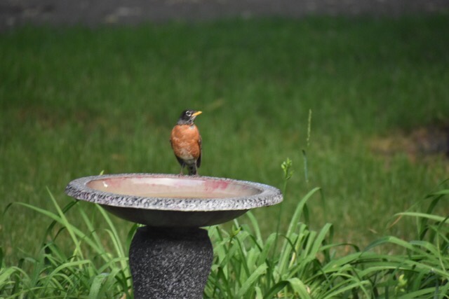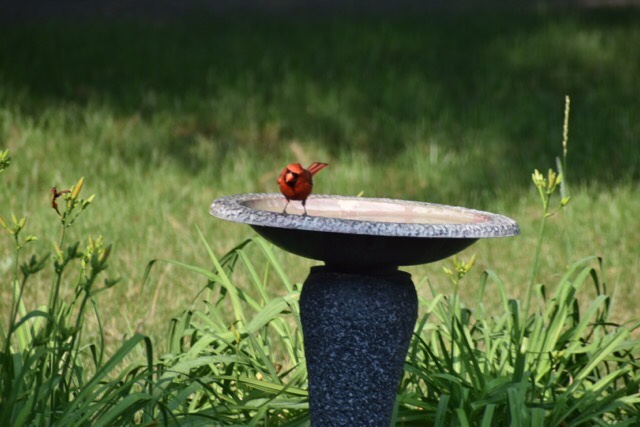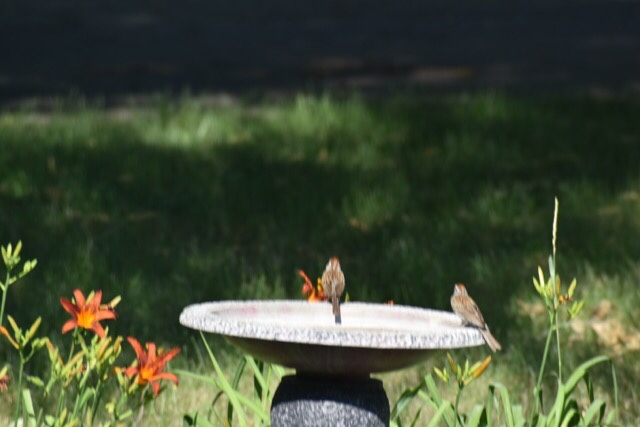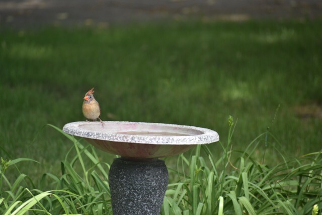 They come and perch on our bird bath, like dignified and well-dressed guests in need of a place to rest their weary feet. I don’t see them bathing very often, just perching, watching and thinking birdie thoughts. They don’t stay long. I am always glad of their brief patronage and hope our bird bath gets good reviews since I put in fresh water daily.