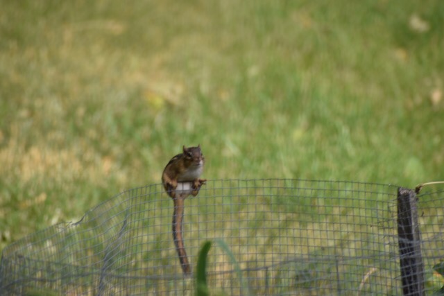 One day I looked out to see a different kind of critter perching on the compost fence, but with no dignity whatsoever. He had a hard time balancing and looked more like a clown working the high trapeze act at the circus to get a few laughs. I gave them to him.