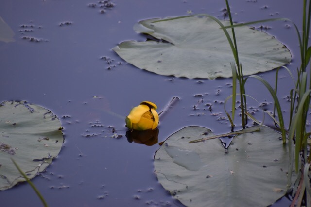By the time we got to the Big Bog campsite, the rain had stopped, so we were able to get set up in the sun and start drying some of our stuff off. The campground is in the southern unit of the SRA and our site was right next to the slow-moving Tamarac River, where I found more reflections and a lily pad flower.